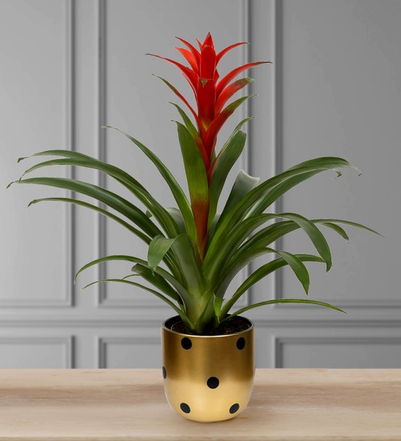 En güzel salon çiçeklerinden biri olan Guzmania, şimdi özel puantiyeli vazosunda. Sevdiklerinizin salonları için ya da kendi eviniz için sipariş verebileceğiniz bu gösterişli çiçek, uzun yıllar size yarenlik edebilir. Anavatanı Brezilya olan guzmania, bir iyi enerji çiçeğidir. Yağmur ormanlarının ruhunu ve yenileme enerjisini taşıyan bu çiçek ile yaşam alanınız doğanın mükemmel dengesi ile iyileşecek ve canlanacak. Bereket getirdiğine inanılan guzmania; aynı zamanda yeni başlangıçları kutlamak için en güzel hediye!